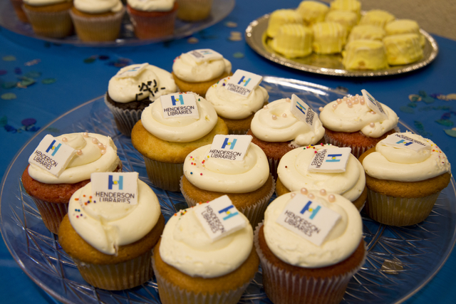 At the Green Valley Library event, tables were set up in the gallery space featuring refreshments, small promotional items bearing the new Henderson Libraries logo and information about programs and services.