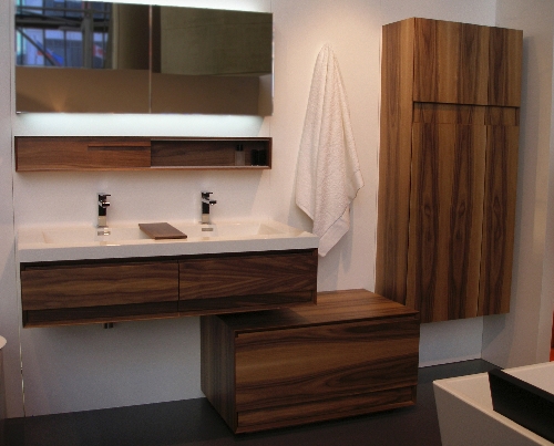 There is an Asian aesthetic to the simplicity of form and function in all WetStyle's products, custom-made with fine finishing details inside and out. Cabinet finishes are available in light and dark wood veneer, as well as white and black lacquer. You will notice that wood grain is a popular design element in today's bathroom and kitchen cabinetry. The wood is cut so that the graining matches or repeats exactly on the doors and drawers. Several coats of matte or gloss urethane highlight the wood's color and pattern, and seal it for necessary durability.