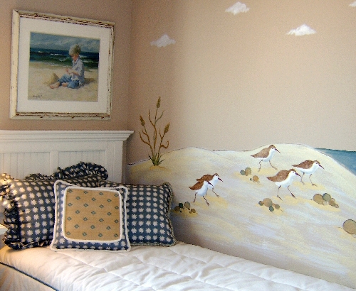 Another boy/girl room that I’ve done had a sand castle beach theme. I used two twin beds with white and pine furniture. The color scheme was sand, ocean blue and seagrass green. I used sand-colored comforters on both beds with a blue duster for the boy and green for the girl. Then I mixed and matched the colors and fabrics on the two beds. I used checks, stripes and a star pattern fabric. For the artwork I had a mural of a boy building a sand castle on one wall, with a girl playing in the sand with a pail and shovel on the other. Then, around the room we painted sand pipers running along the sand. This was a lighter more pastel color scheme that looked wonderful.