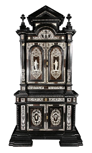 A 2011 Neal Auction Co. sale in New Orleans offered a mid-19th-century cabinet in the Renaissance (1460-1600) style made of expensive Circassian walnut with ebony and ivory trim. Today's endangered-species laws have banned the use of most types of ebony and elephant ivory. The cabinet was a good copy, heavy and rectangular. It had a base, columns, moldings, finials, carvings, paneled doors, elaborate decorations and about 15 drawers and four doors. Some experts say cabinets like this were made to resemble imaginary buildings.