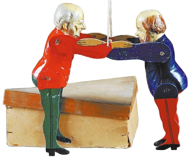 Political cartoons of the time often showed the two men fighting. There were even toys that pictured the men wrestling. Several versions of the toy have been sold through the years. In 2013, Jackson’s Auctions sold a pair of 8½-inch-high Gladstone and Disraeli figures in their original box for $180.