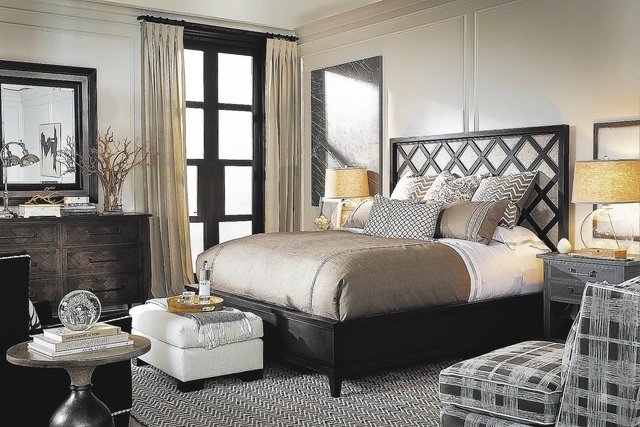 Other geometric patterns can be found in the metal fretwork of the Focal Point console and drum tables, wood fretwork in the Block Party display cabinet and buffet and Stencil bed, a key piece in the collection.