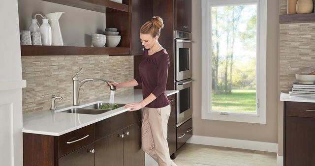 The Voss pullout kitchen faucet from Moen offers just the right height. Its lower-profile spout is ideal for installations near a window or on an island, while still providing ample room to fill large pots, reduce splashing and improve rinsing in and around the sink.