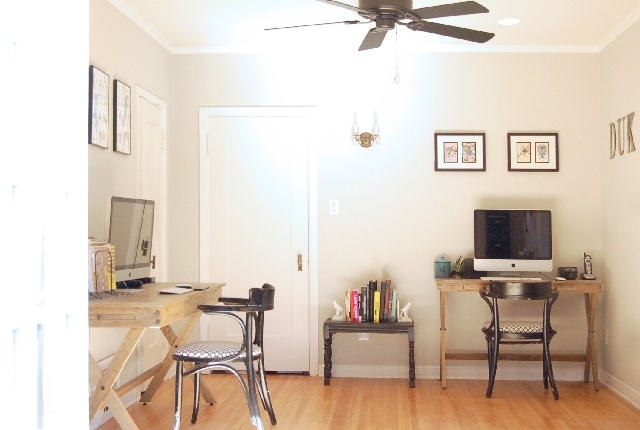 When setting up a home office, functionality is key. Not having the right space or enough space can be frustrating and make you nonproductive. I always feel that you should have as large of a desk that you can fit in a room, since most of us need room to spread out when working. When you’re trying to fit in two work areas, you have a couple of options.