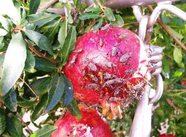 Adult leaf-footed plant bugs survive the winter feeding on evergreen plants in our landscapes. They begin laying eggs as soon as new growth appears on fruit trees or the vegetable garden has been planted. They cause pomegranate fruit to drop, pistachio nuts to drop or develop no nut on the inside, almonds to drop from the tree before they are ready and cause similar damage to vegetables.