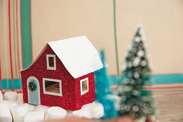 “You can make them to scale and (create) a little village with them,” Waggoner said of the glittery cardboard cabins, noting that they can also be staged atop fireplace mantles or hung as ornaments on Christmas trees.