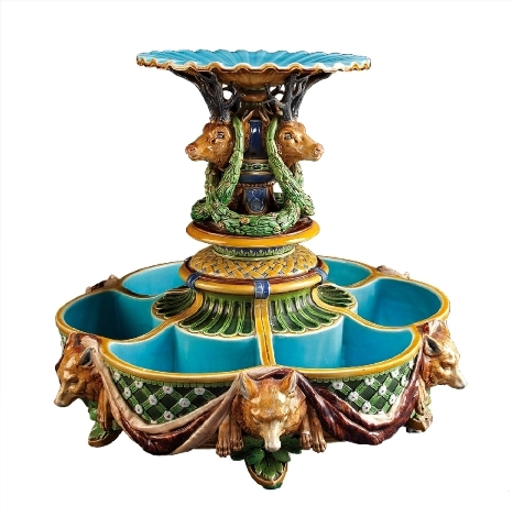 An 1865 Minton ice stand decorated with stag heads, wolves and pine cones sold for $8,610 at a May Neal auction in New Orleans.