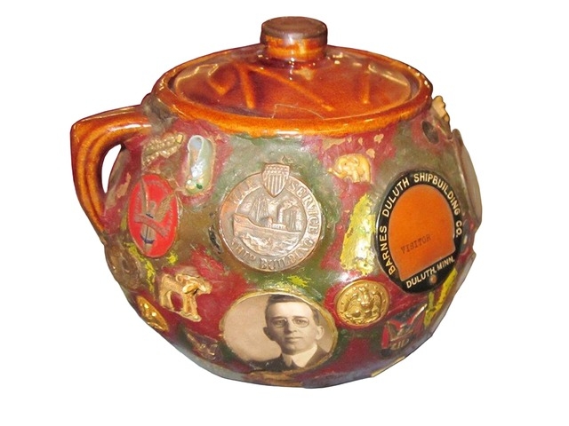 Today the jugs are considered folk art and sell for $50 to $300 at shows, but a few exceptional antique examples have brought up to $3,000. Most jugs can be dated by examining the things stuck in the plaster. Campaign buttons, coins and toy parts often suggest a date, but remember that new jugs can be made using old parts. A small percentage of old or new jugs are finished with a coat of gold paint or lacquer.