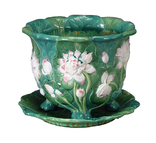 Minton's majolica was displayed at the 1851 exhibition, and by the 1870s the company was making original designs inspired by Italian majolica. Its work was copied by many English, European and American makers. Later, Minton made majolica using colored glazes painted directly on the clay body. Designers made fanciful pieces like teapots with monkey handles; pitchers featuring birds, fish, shells and flowers; urns held by swans; tables held by monkeys; and jardinieres decorated with all types of flowers, birds and trees.