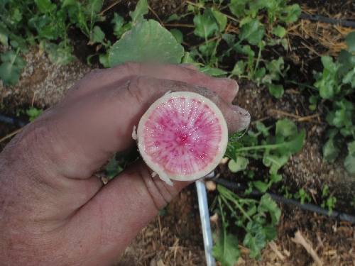 Radishes are ready in just 30 days, germinate in very cold soils and are easy to grow. Follow the same directions but plant them 2 inches apart in rows or in blocks. Daikon, the really big ones, should be 8 to 10 inches apart. Some favorites include Icebox, French Breakfast, Pink Beauty, Early Scarlet Globe, Chinese Red Meat, Philadelphia White Box and Purple Plum. They really are fun to grow with all those different colors.