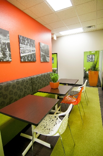Three Foot Ninja created a fun and functional design for Logistical Solutions' office. The project transformed an existing office warehouse into a space that "mimicked the personality of both the company and, more importantly, the client," according to their design statement. The design incorporated bright shades of chartreuse and orange along with white.