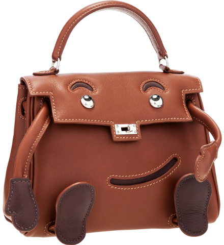 The humorous bag, with a smiling face, leather arms and feet, and a silver-colored metal “nose” and “eyes,” brought $18,750. The price included the dust bag and box.