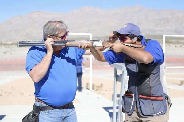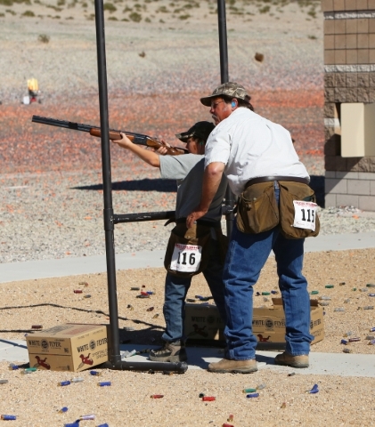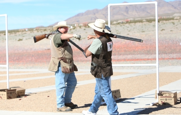 Mark Kovacevich, right, watches his 10-year-old son Mark II as he participates in the biggest clay shooting competition Saturday, Feb. 14, 2015 at the Clark County Shooting Complex on 11357 N. Decatur Blvd.(Bizuayehu Tesfaye/Las Vegas Review-Journal)