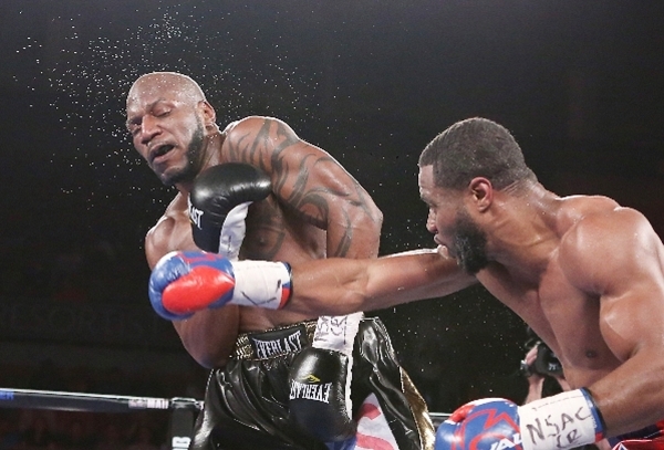 Jean Pascal of Canada, right, connects a right punch against Yuniesky Gonzalez of Cuba during their light heavyweights title match on Saturday, July 25, 2015 at Mandalay Bay hotel-casino. Pascal won by unanimous decision. (BIZUAYEHU TESFAYE/LAS VEGAS REVIEW-JOURNAL) FOLLOW HIM: @bizutesfaye