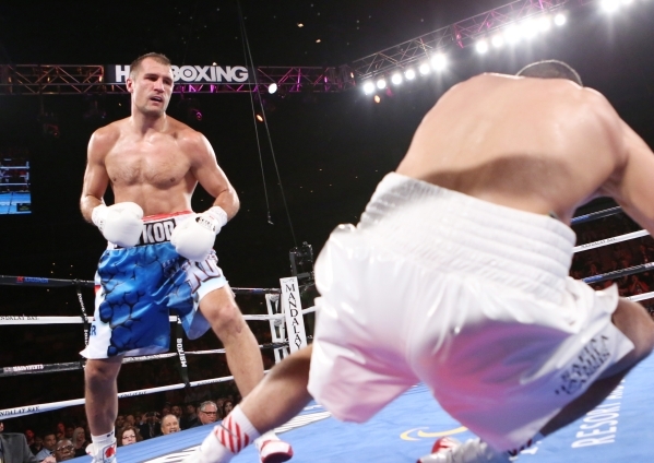 Light heavyweight champ Sergey Kovalev, left, of Russia knocks down Nadjib Mohammedi of France in the third round during their IBF light heavyweight title bout on Saturday, July 25, 2015 at Mandalay Bay hotel-casino. Kovalev won in the third round knockout. (BIZUAYEHU TESFAYE/LAS VEGAS REVIEW-JOURNAL) FOLLOW HIM: @bizutesfaye