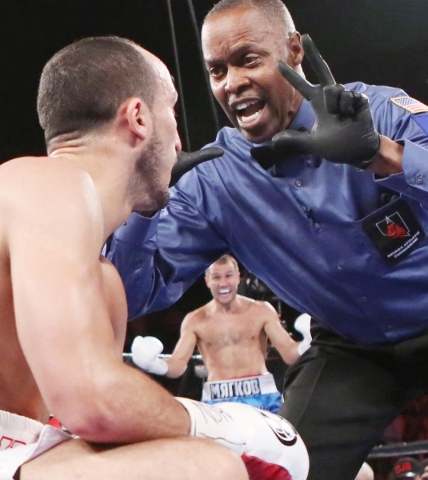 Referee Kenny Bayless gives Nadjib Mohammedi the count after being knocked down by light heavyweight champ Sergey Kovalev, center, of Russia in the second round during their IBF light heavyweight title bout on Saturday, July 25, 2015 at Mandalay Bay hotel-casino. Kovalev won in the third round knockout. (BIZUAYEHU TESFAYE/LAS VEGAS REVIEW-JOURNAL) FOLLOW HIM: @bizutesfaye