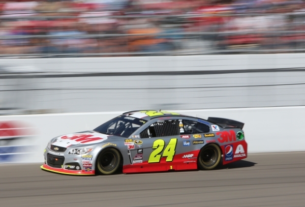 Jeff Gordon (24) accelerates during the NASCAR Sprint Cup Series Kobalt 400 race at the Las Vegas Motor Speedway on Sunday, March 8, 2015. (Bizuayehu Tesfaye/Las Vegas Review-Journal)