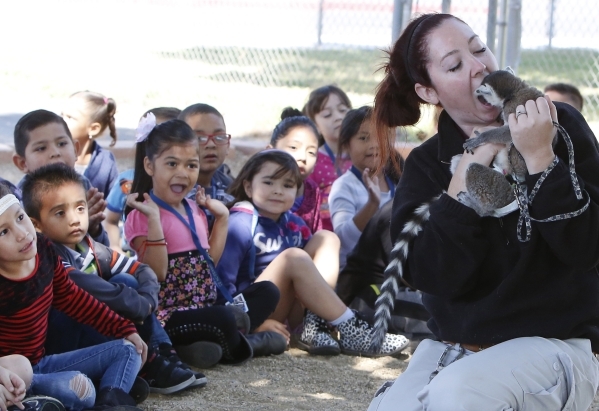 Students react as zookeeper Jessica Hogan allows a ring-tailed lemur checks her cavity at Oran K. Gragson Elementary School in Las Vegas Friday, April 17, 2015, during an educational visit from Roos N More. The visit was funded through the McDonald? Make Activities Count Grants. (Bizuayehu Tesfaye/Las Vegas Review-Journal) Follow Bizu Tesfaye on Twitter @bizutesfaye