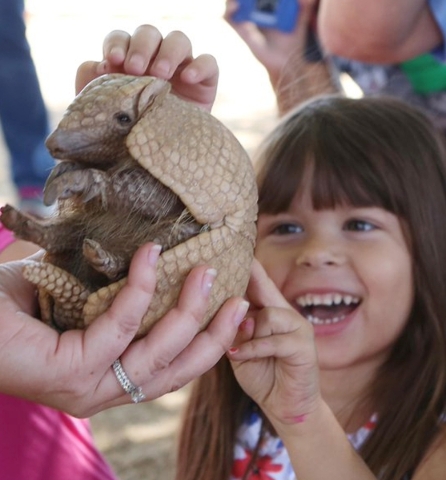 Five-year-old Elena Warner reacts as she pats an armadillo at Oran K. Gragson Elementary School in Las Vegas Friday, April 17, 2015, during an educational visit from Roos N More. The visit was funded through the McDonald´³ Make Activities Count Grants. (Bizuayehu Tesfaye/Las Vegas Review-Journal) Follow Bizu Tesfaye on Twitter @bizutesfaye
