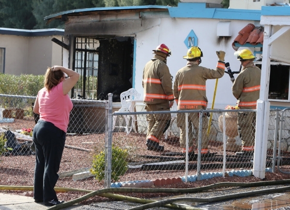 A woman whose home was destroyed in Monday‘s morning fire reacts as she tried to determine the extent of the damage at 1708 Pacific St., near the intersection of Oakey Boulevard and Eastern Avenue on Monday, Jan. 5, 2015. A person was rescued from the burning house, according to Las Vegas Fire Department. (Bizuayehu Tesfaye/Las Vegas Review-Journal)