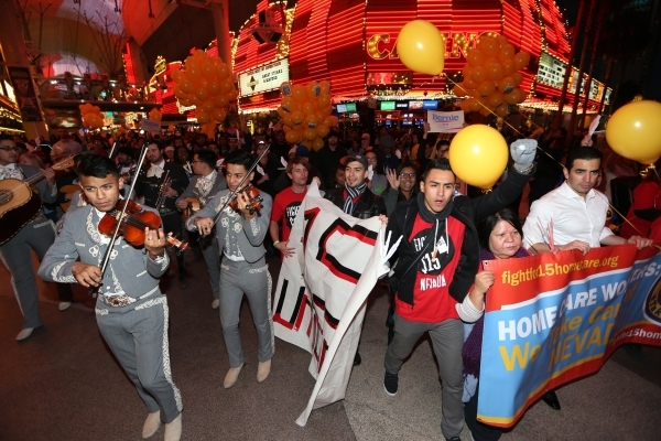 Demonstrators march on Fremont Street to McDonald‘s inside The D Las Vegas casino-hotel for a Fight For $15 rally Tuesday, Nov. 10, 2015 in Las Vegas. Fast food workers and supporters demand for a $15 hourly wage and union rights. Erik Verduzco/Las Vegas Review-Journal Follow @Erik_Verduzco