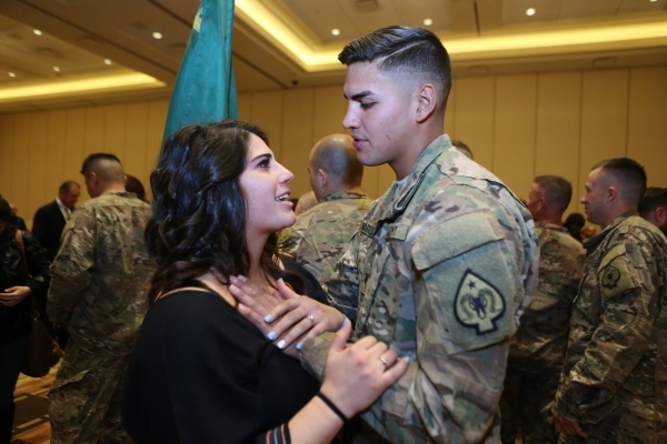 Elyssa Graziano, left, and her fiancé Spc. Jericho Magallon share a moment during his mobilization ceremony with about 35 other soldiers of the Nevada Army National Guard´s 137th Military Police Detachment at Aliente casino-hotel in North Las Vegas Tuesday, Nov. 24, 2015. Erik Verduzco/Las Vegas Review-Journal Follow @Erik_Verduzco