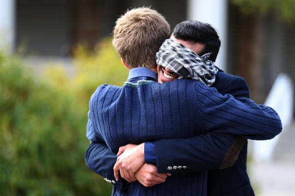 Muslim UNLV student Naweed Yusufzai, right, shares a hug with fellow student Glen Ellefson as he stood blindfolded on a walkway at UNLV to promote acceptance, love, and trust for one another as a Muslim on Friday, Dec. 4, 2015. Erik Verduzco/Las Vegas Review-Journal Follow @Erik_Verduzco