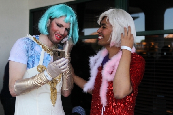 Stephen Morris, left, and James Fajardo in costume as a drag queens, share a photo of each other following an event for the Guinness World Records largest drag queen stage show at Hard Rock Cafe in Las Vegas Sunday, April 12, 2015. All the benefits of the events were going to be donated to The Gay and Lesbian Community Center of Southern Nevada. Erik Verduzco/Las Vegas Review-Journal Follow @Erik_Verduzco