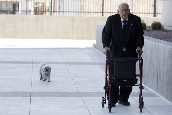 Salvatore Ruvolo, co-defendant in a federal case involving fraud and corruption at Las Vegas homeowners associations, walks to Lloyd George Federal Courthouse in Las Vegas with his dog Cooper Wednesday, Feb. 25, 2015. Erik Verduzco/Las Vegas Review-Journal Follow @Erik_Verduzco