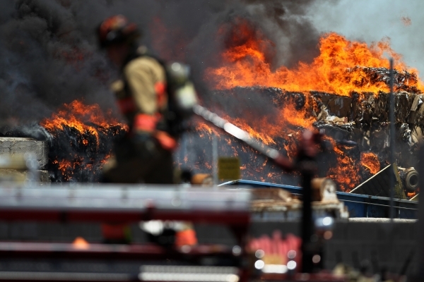 Fire crews from multi-agencies battle a fire at the Las Vegas Recycling facility near Commerce Street and Miller Avenue in North Las Vegas Tuesday, June 16, 2015. Erik Verduzco/Las Vegas Review-Journal Follow @Erik_Verduzco