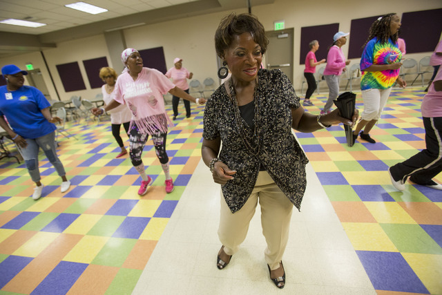 Lucy Eatmon, the 78-year-old woman who started these Las Vegas FanciDancers dance/exercise sessions with the late Crystal Marble, watches as the smiling women turn, step, slide, stride in unison.