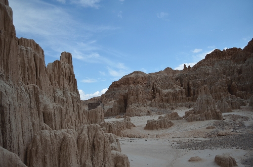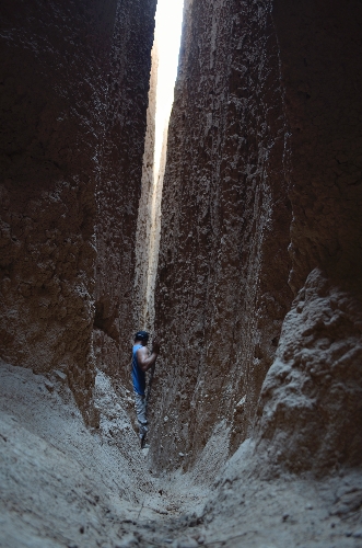 But the most surreal site of the area is the clay caves of Cathedral Gorge State Park off U.S. 93, just south of Pioche. Although roofless, the winding channels are like caves, dark and cool because the stalactitelike walls extend straight up 50 feet or more. Sunlight rarely makes its way to the floor. The tall walls are only a foot or two apart, sometimes less, making for a narrow slit to squeeze through, forcing me to abandon my backpack halfway through.