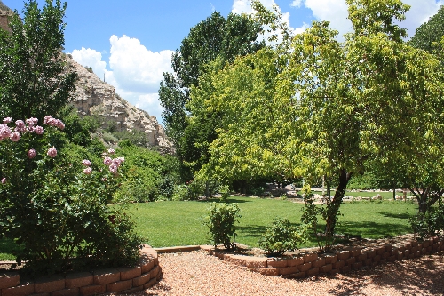 Returning to the main drag of Rainbow Canyon, we made our way south. Mature cottonwoods and ash thrive here, and behind them, in lovely contrast to the new green leaves, red and orange cliff walls tower on both sides of the road. Occasionally we passed ranches, farms, fruit orchards. Until recently, the road was in terrible shape, and the lower 10 miles were practically impassable because of major flooding in 1995. The road has been recently reconstructed in some places and completely repaved; it is once again a joy to drive.