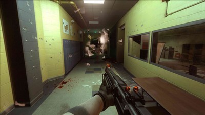 As an orchestra swells, Alma pops up in front of you unexpectedly. So do villainous soldiers, as well as glob-people who crawl fast on the ground at you. All this happens in dark rooms, as you walk forward by way of a flashlight attached to your gun. You turn corners. Suddenly, glob-people are in your face.