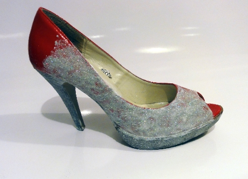 Step 1: Use the Mod Podge Glitter to create a base, applying an even and light layer along the platform and heel of the shoe.