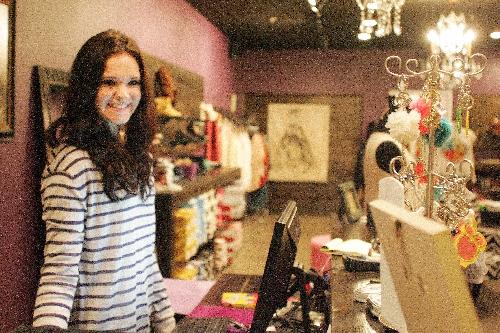 Feather knew that the boutique needed to reflect her brand in its design as well. Throughout the summer, she scoured Las Vegas and California antique shops, discovering a zebra chair, crystal chandeliers, a pink sofa, distressed shelves and trunk, unique artwork and bright purple paint for the walls. As she collected her finds, her family had growing concerns whether it would all work together, but Feather knew her brand and how to package it.