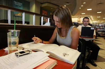 Sanders, 28, relayed her findings while sitting in the Barnes & Noble Cafe on a recent Wednesday, her college textbooks opened before her. She, herself, had no intention of purchasing anything more than the Frappuccino that was close at hand.