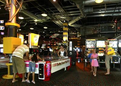 Not only can you race (virtual) Indy 500 cars and ride WaveRunners, gamers can stretch their legs and test their skills on the Las Vegas Rock, a rock-climbing wall in the center of the arcade. Climbers who reach the top get to ring a bell.