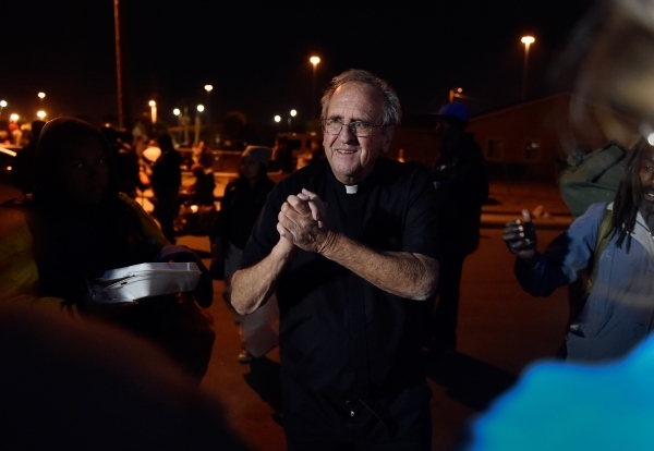 Helping the homeless in Las Vegas is John McShane’s weekly ritual, and there are many that gather in the open lot for spiritual encouragement and the distribution of food, blankets, coats and other clothing in what is called Give Back Mondays.