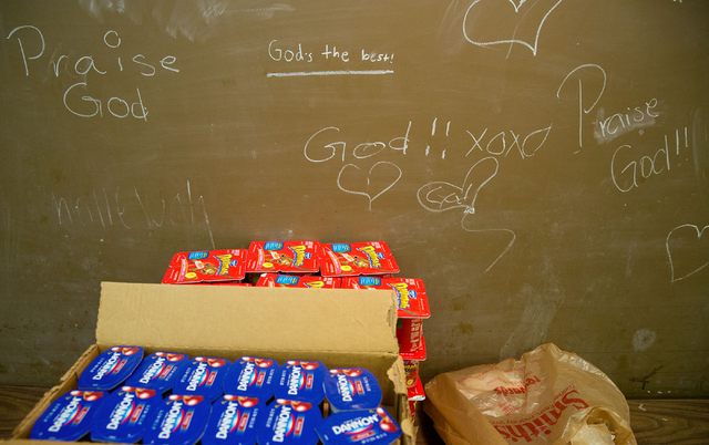 “It was something God asked me to do. I had been very ill, and I got quite the overwhelming feeling of, what have I ever done for anyone other than myself or my own, and I realized — nothing,” Coughlin says. Now living in a trailer and, with church assistance, Coughlin helps homeless people find clothing and food — the latter including the church’s food pantry, associated with Three Square food bank.