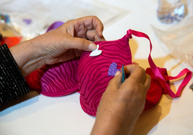 Next to a bra sporting googly eyes, another bra makes less eye contact, but still stands out. Hot pink and tiger-striped, it’s decorated with flowers and birthday cakes — flung across a table.