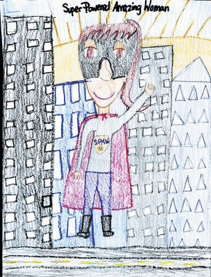 Super-Powered Amazing Woman became her because one day she was working on an invention doing a really hard test. Something went wrong and she got all these powers. That's how S.P.A.W. became S.P.A.W., the superhero.