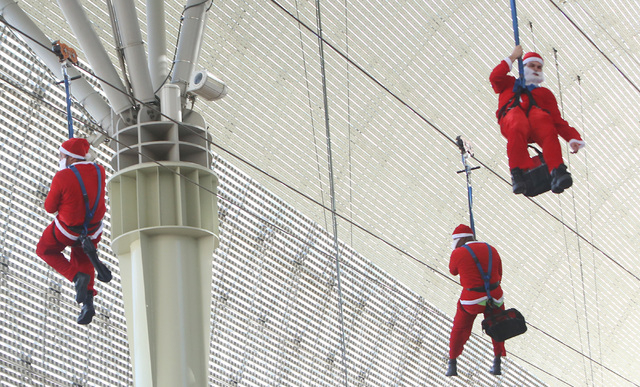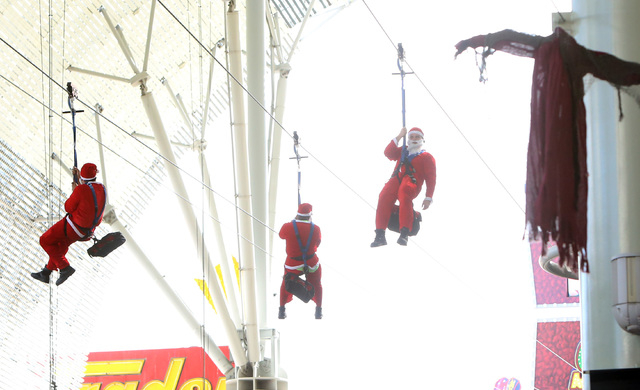 As the 10th Anniversary 'Las Vegas Great Santa Run' approaches, downtown got a dose of holiday spirit as several Kris Kringles zoomed over the crowd on Las Vegas' newest zip line attraction, Slotzilla, during an event Friday, Oct. 17, 2014, at Third Street Stage on Fremont Street Experience in downtown. The 10th Anniversary Las Vegas Great Santa Run will be held on Dec. 6, 2014. (Bizuayehu Tesfaye/Las Vegas Review- Journal)