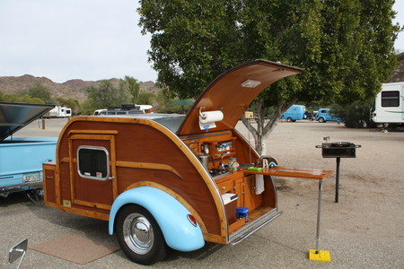 During our visit, we found a gathering of people who own teardrop trailers, both vintage and new. Teardrop travel trailers were named for their shape. They typically have a sleeping cabin just big enough for two and a galley located under a lift hatch at the rear of the trailer so the cook can stand on the ground while preparing a meal. But their exceptionally compact features allowed them to be streamlined and light enough to pull with almost any auto, so they were popular from the 1940s to the 1960s. There were other classic trailers, including many of the teardrops' somewhat bigger relatives from the same era, often called the "canned ham" style.