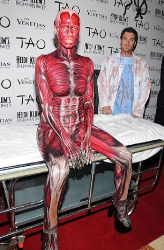■ Heidi Klum u25B6 attends a Halloween party at Tao at The Venetian wearing a costume that looks like one of the formerly living people from "Bodies: The Exhibition." Is it creepy to say that she still looked kind of hot?