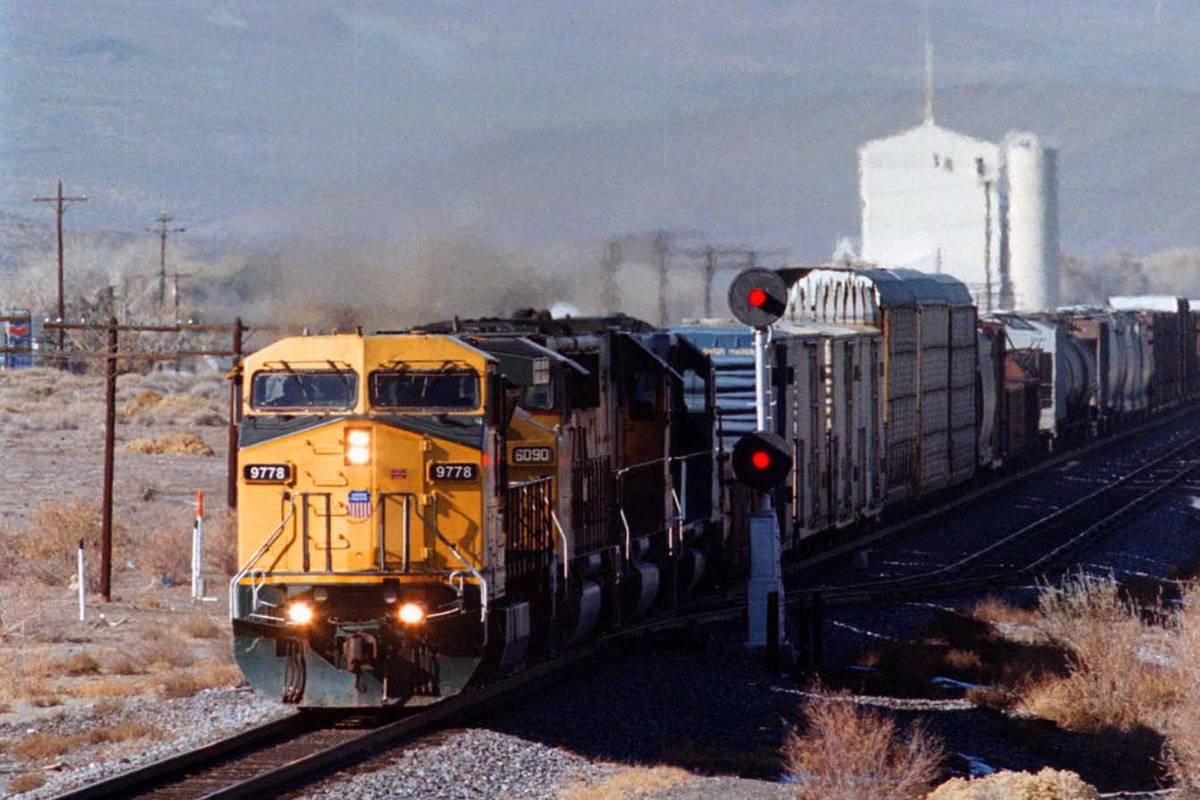 The train, which had nearly 100 cars, tipped on its side after derailing near Lund, about 85 miles from the Nevada border.