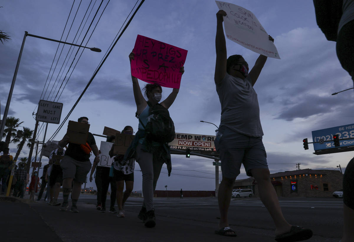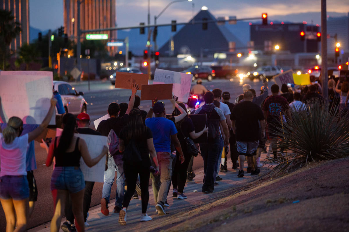 As the group of about 150 demonstrators made a loop around University Center Drive, Tropicana Avenue, Paradise Road and Harmon Avenue, keeping it peaceful and organized, dozens of law enforcement officers flanked the group, driving within a few feet of them on the road.