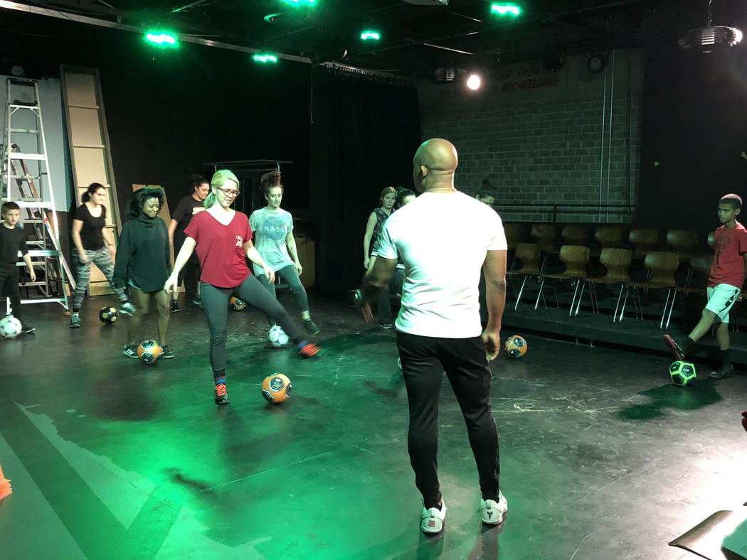 The play is also extremely physical. While the characters are talking, they’re also stretching or performing warmups and drills, such as high knees and butt kicks, and the complicated “spider web” passing drill.