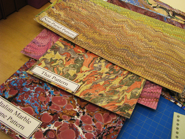 “You come in with a marbling brush and make various designs and run combs through it to create the pattern, then you dip the paper into it,” Frazier said. “I try to match the pattern on the original book as closely as possible. It’s not easy, but it helps with the aesthetics of the book. I don’t use it often, but it does highlight the level of work we do here.”