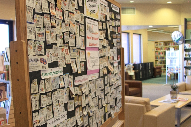 The board is put together by library volunteers who clip coupons each week to update the selections. The library goes through about 100 to 150 coupons per week, Platt estimated.